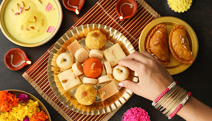 Food is central to Diwali celebrations. Mithai (sweets) like laddus, barfis, gulab jamun, and jalebis are prepared and shared with family, friends, and neighbours. Savoury treats are items such as samosas, pakoras, and puris, and vegetarian feasts often feature paneer dishes, curries, and lentils. Sharing meals is a gesture of love and togetherness, reinforcing bonds as much as delighting the taste buds!