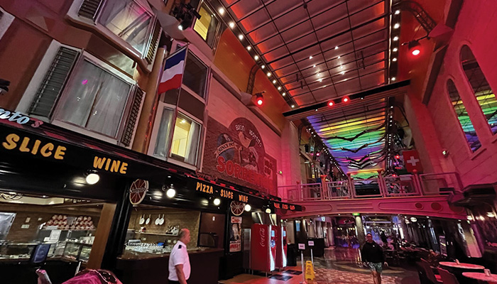 From the moment we stepped foot on board, we were captivated by the ship’s bright and bold interiors. The Royal Promenade instantly wowed us with its sparkling ceiling lights and iconic rainbow bridge, setting the stage for a lively and fun atmosphere. Lined with shops, cafés, bars, and entertainment venues, this bustling thoroughfare feels more like a floating town than a cruise ship.