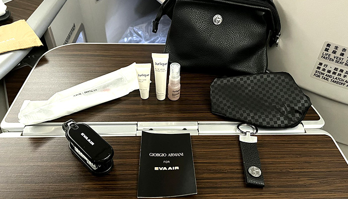 Flying Business Class offered the perfect balance of comfort and privacy, thanks to the 1-2-1 cabin layout with direct aisle access. Each seat transformed into a fully lie-flat bed, complete with premium bedding for a restful journey. Passengers also receive pyjamas, noise cancelling headphones, and a Giorgio Armani amenity kit in a sleek hard case, containing a Giorgio Armani coin purse, as well as luxurious skincare products.